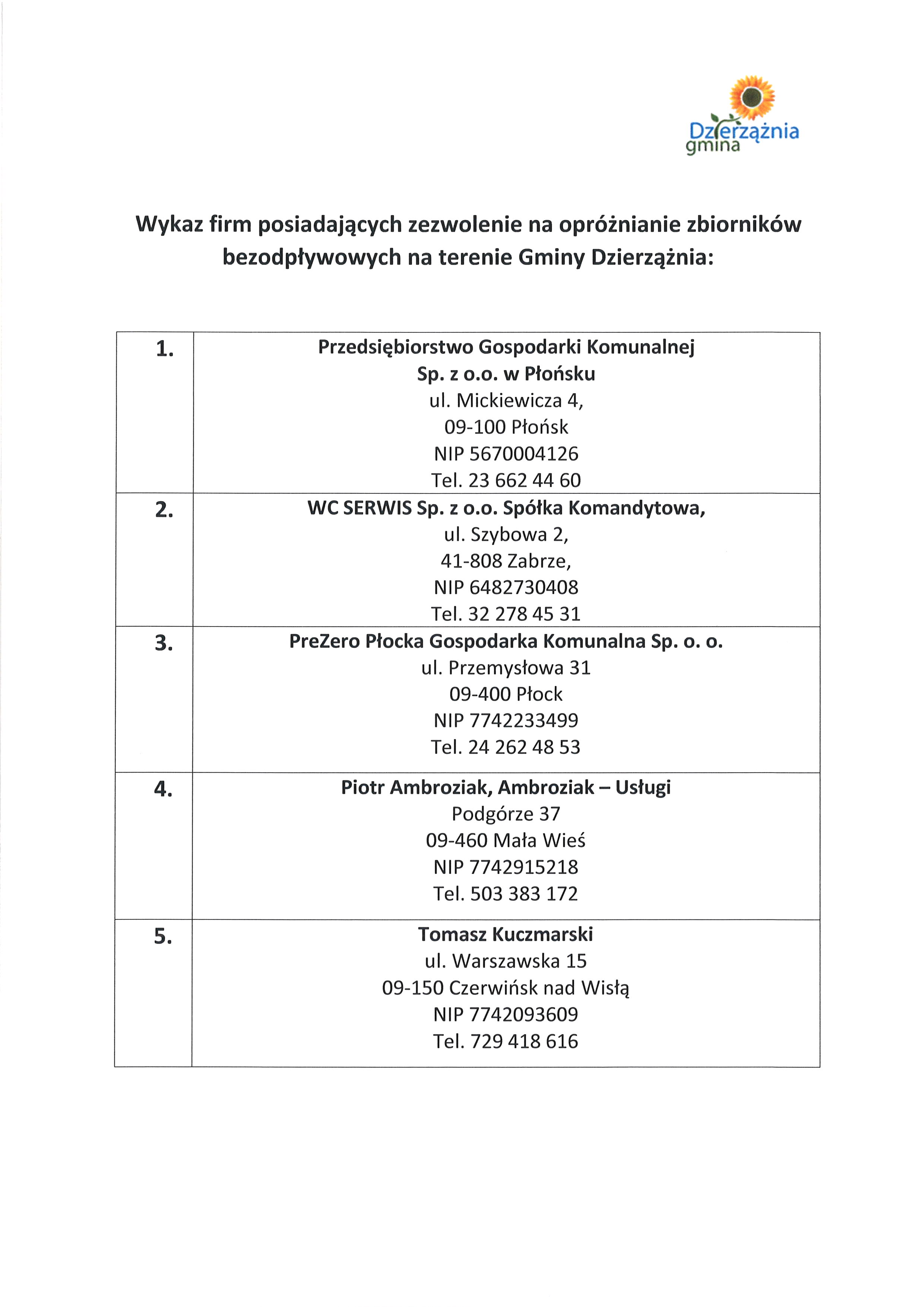 | Lp. | Nazwa Firmy | okres obowiązywania zezwolenia | czego dotyczy zezwolenie | |