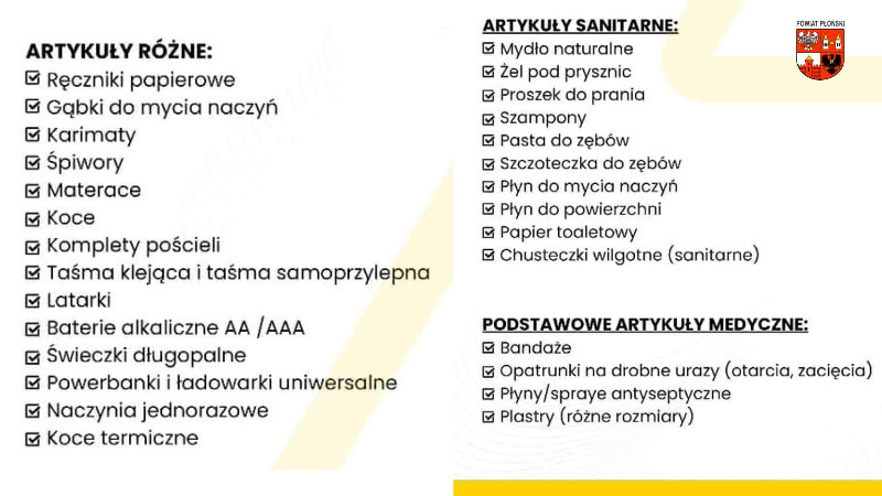 Potrzebna jest również: woda w butelkach; chleb z dłuższym okresem ważności; suchy prowiant: konserwy/batony/mleko w proszku i słoiczki dla dzieci; artykuły higieny osobistej /mokre chusteczki/ ręczniki papierowe/ręczniki; karma dla zwierząt; środki czystości; powerbanki - najlepiej naładowane; baterie.