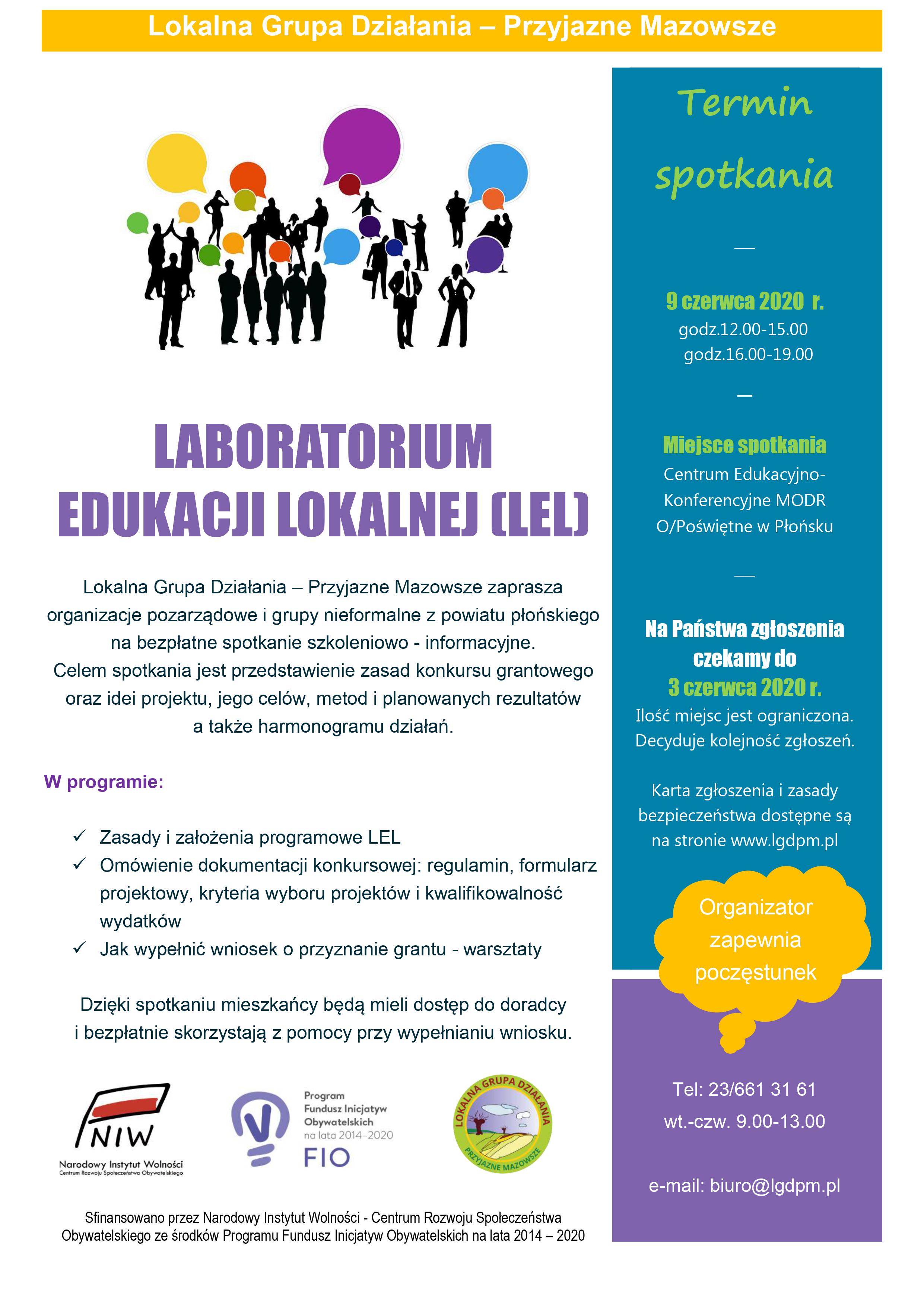 W ramach projektu pn. Laboratorium Edukacji Lokalnej (LEL) sfinansowanego przez Narodowy Instytut Wolności - Centrum Rozwoju Społeczeństwa Obywatelskiego ze środków Programu Fundusz Inicjatyw Obywatelskich na lata 2014-2020, Priorytet 3 Aktywni Obywatele, Lokalna Grupa Działania - Przyjazne Mazowsze serdecznie zaprasza organizacje pozarządowe oraz grupy nieformalne z powiatu płońskiego do wzięcia udziału w bezpłatnym spotkaniu szkoleniowo-informacyjnym, które odbędzie się 9 czerwca 2020 r. w Centrum Edukacyjno-Konferencyjnym MODR O/Poświętne w Płońsku.