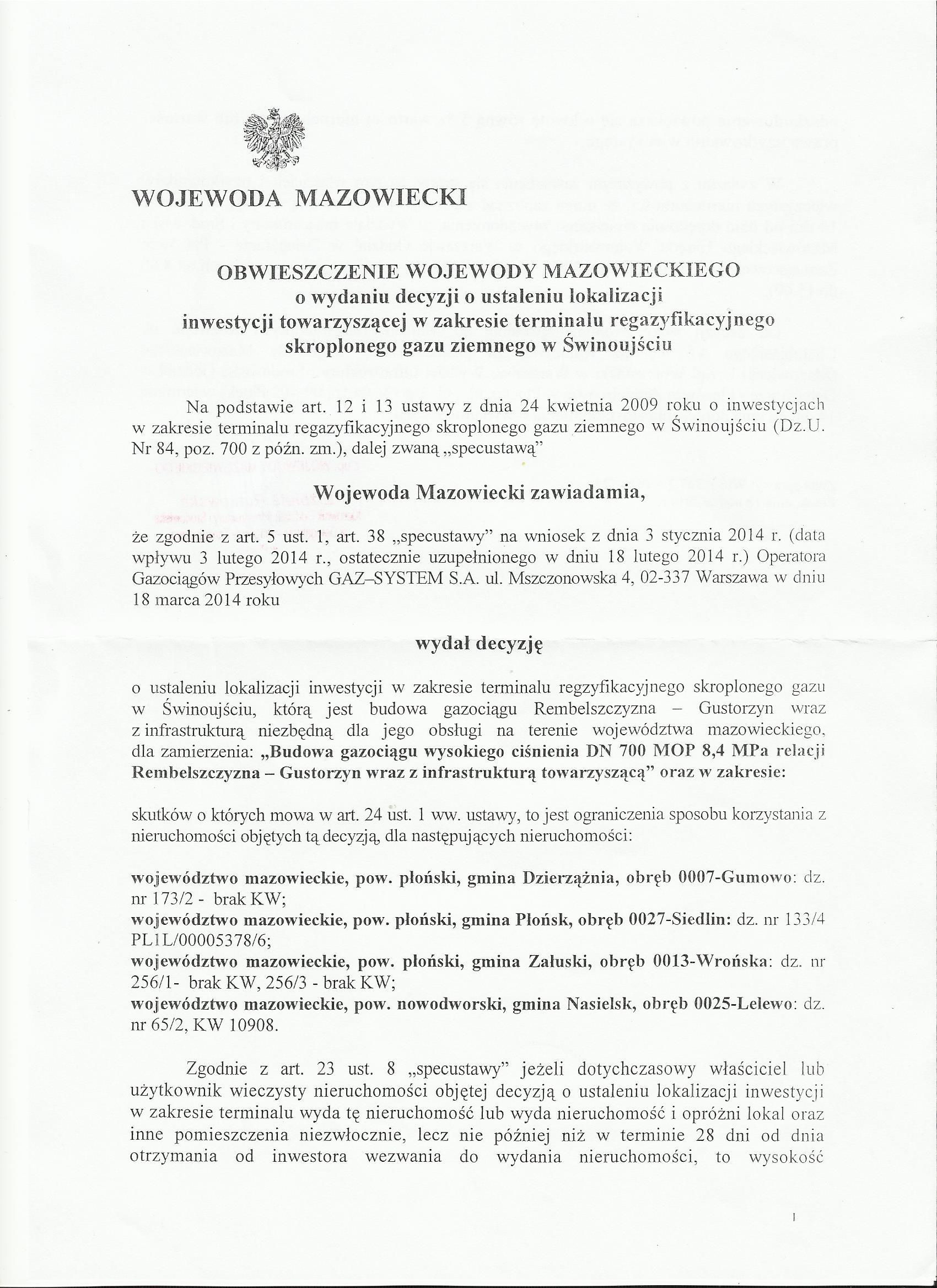 OBWIESZCZENIE WOJEWODY MAZOWIECKIEGO Z DNIA 18 MARCA 2014R.