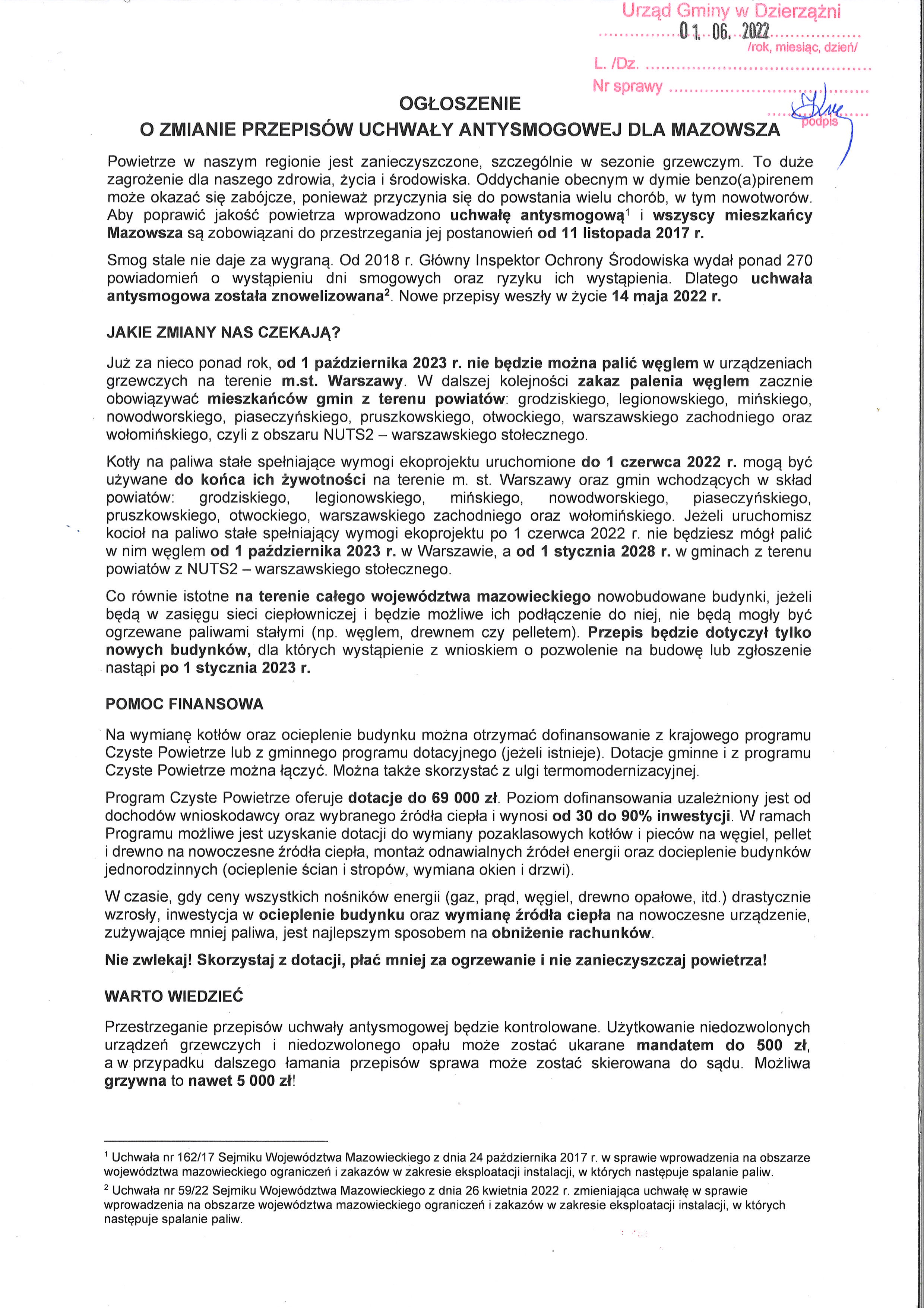 INFORMACJA DLA MIESZKAŃCÓW GMINY DZIERZĄŻNIA