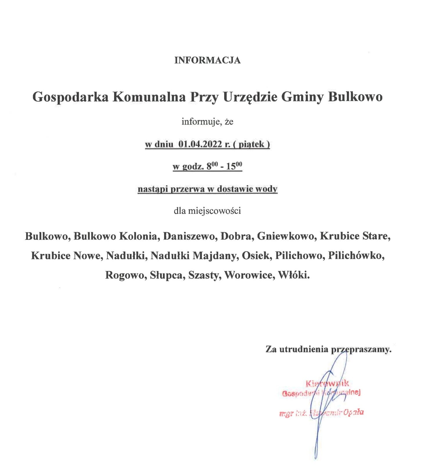 Informacja o wyborze najkorzystniejszej oferty na: " Budowa sieci wodociągowej w miejscowości Gumowo na odcinku ok. 140mb w formie zaprojektuj i wybuduj"