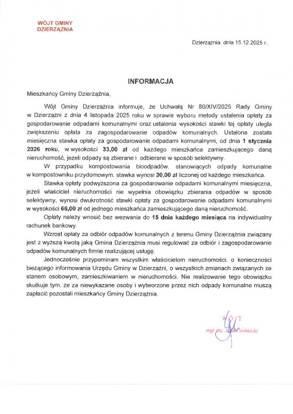 INFORMACJA DLA MIESZKAŃCÓW GMINY DZIERZĄŻNIA