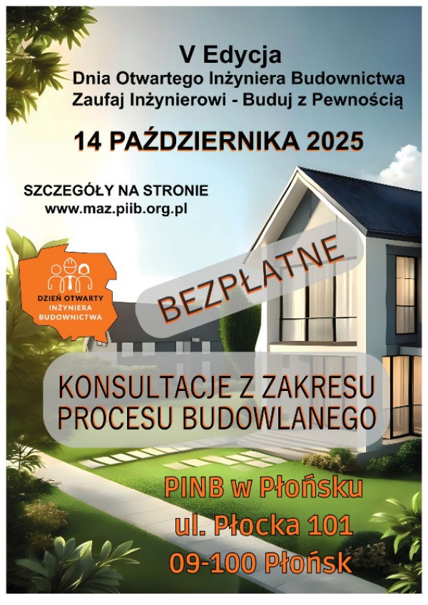 Powiatowy Inspektor Nadzoru Budowlanego w Płońsku wraz z Mazowiecką Okręgową Izbą Inżynierów Budownictwa zaprasza wszystkich mieszkańców powiatu płońskiego na V edycję corocznego Dnia Otwartego, który odbędzie się 14 października. Tegoroczne hasło przewodnie akcji brzmi: „Zaufaj Inżynierowi – Buduj z Pewnością”. W ramach wydarzenia, inżynierowie budownictwa będą udzielać bezpłatnych porad dotyczących wszystkich aspektów przygotowania inwestycji budowlanej, budowy i remontu. Bezpłatne konsultacje dla wszystkich zainteresowanych osób zostaną przeprowadzone w godzinach 14-18, w siedzibie PINB w Płońsku, ul. Płocka 101. Inicjatorem i organizatorem akcji na Mazowszu jest Mazowiecka Okręgowa Izba Inżynierów Budownictwa.